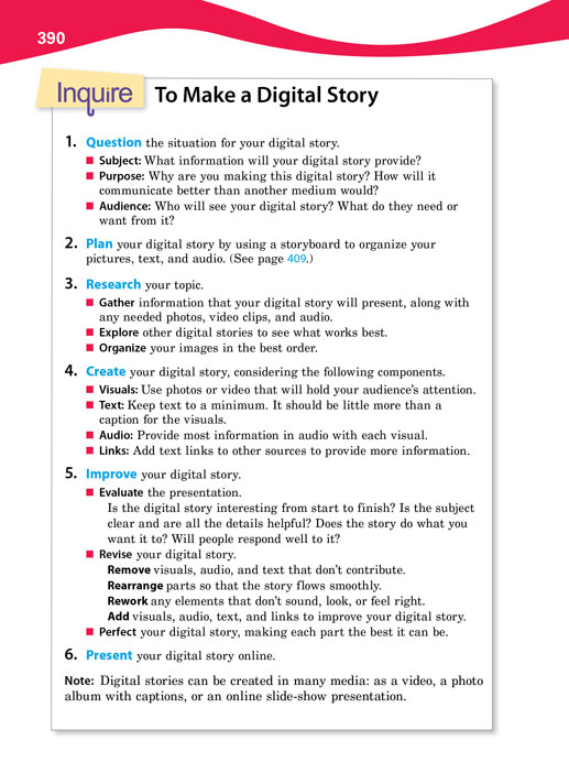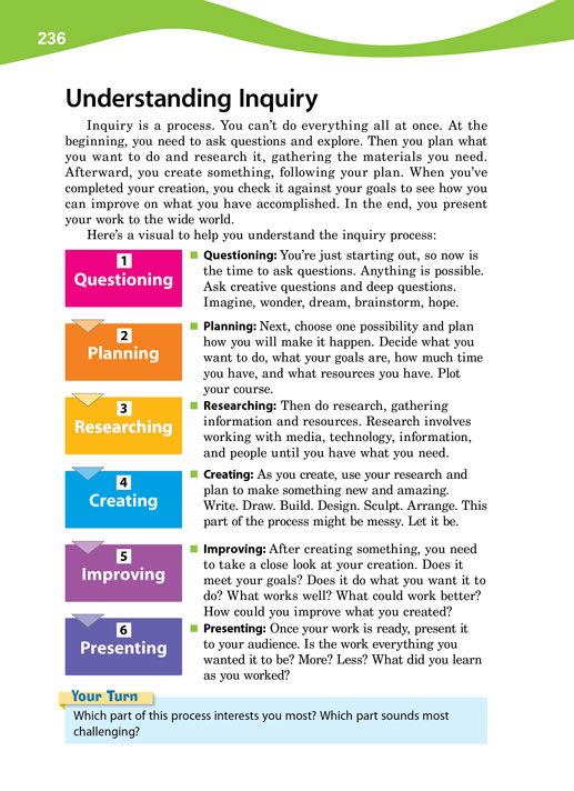 Inquire is a complete learning guide, covering 21st century skills, traditional study skills, the inquiry process, and project-based instruction. It is best used as an across-the-curriculum handbook, helping students with all aspects of their thinking and learning. It can also be used as the main resource in a research or study-skills course or in inquiry-based and project-based programs.