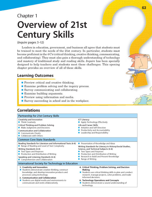 The Inquire Teacher's Guide correlates to the key standards for 21st century skills, writing, speaking, listening, and literacy across the curriculum. To view standard correlations, click on the appropriate set of standards below: